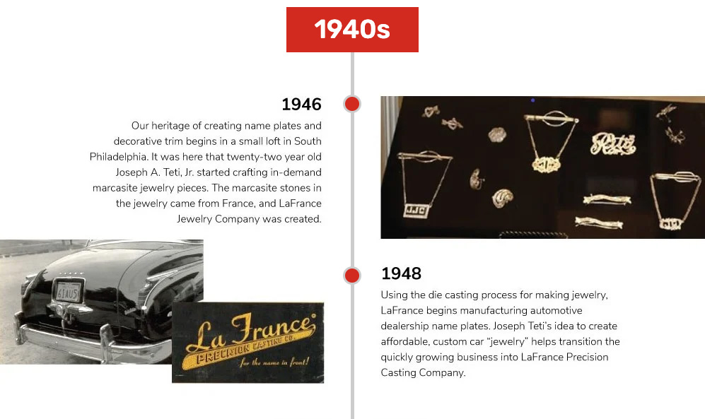 From modest beginnings in South Philadelphia, LaFrance Corp was born from the vision of our founder, Joseph A. Teti, Jr. Starting out in the jewelry business in 1946, Joe recognized a match between LaFrance’s precision manufacturing capabilities and a market need for high-quality product branding.